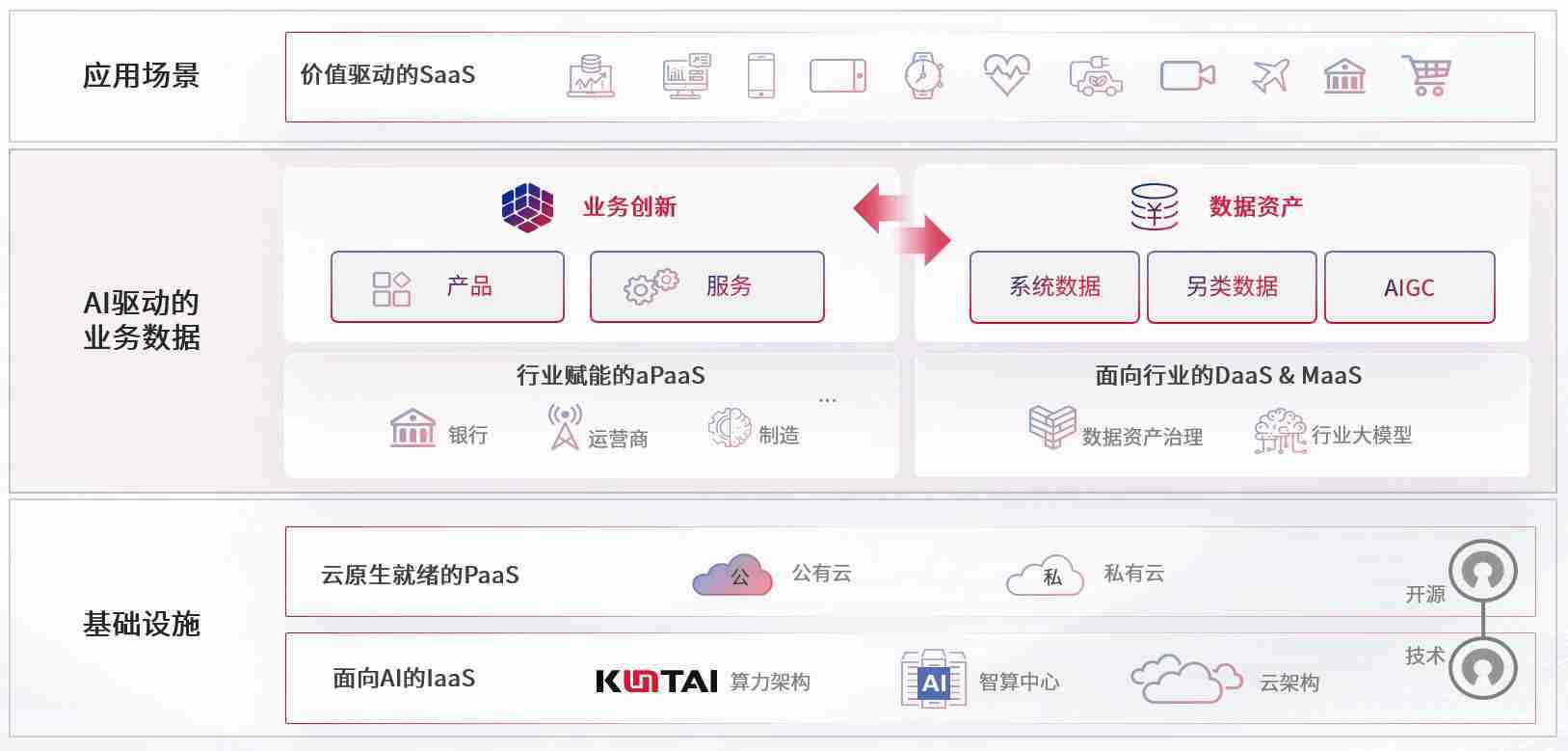 数字时代,,围绕企业数字化转型的关键要素,,太阳成集团122ccvip数码开创性的提出数云融合战略和技术体系框架,,着力在云原生、、、数字原生、、、AI原生和信创产业上架构产品和服务能力,,,,为处在不同数字化转型阶段的快消零售、、汽车、、金融、、医疗、、、政企、、教育、、、运营商等行业客户提供泛在的敏捷IT能力和融合的数据驱动能力,,,构建跨界融合创新的数字业务场景和新业务模式,,助力企业级客户建立面向未来的核心能力和竞争优势,,全面推动社会的数字化、、智能化转型升级。。。